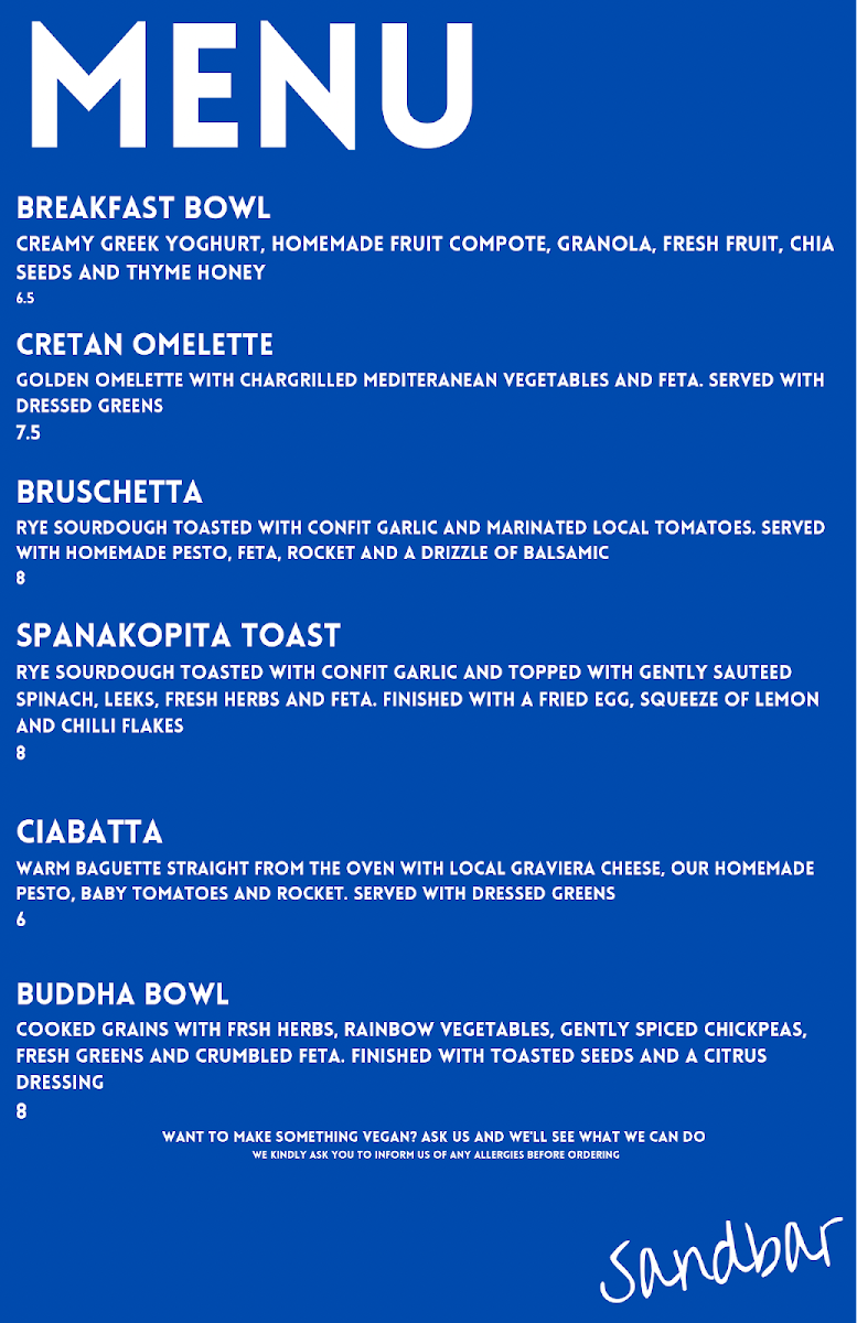 Whether you are looking for a tranquil breakfast spot, a place to enjoy a leisurely brunch, or a cozy corner to grab a pastry and coffee as you explore Chania, Sandbar has it all. The beautiful seaside setting, accommodating staff, and delicious, thoughtfully crafted menu options make this café a must-visit destination. Do yourself a favor when in the area—savor every bite at Sandbar!